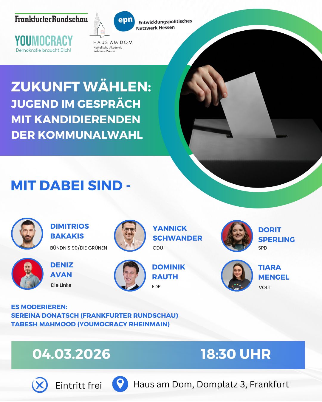 Wir organisieren eine Podiumsdiskussion mit Kandidierenden der Frankfurter Kommunalwahl. Damit auch junge Stimmen gehört werden, brauchen wir dich! Im Workshop am 04. Februar bereiten wir Themen und Fragen vor, denen sich die Politiker*innen bei der Podiumsdiskussion stellen müssen.