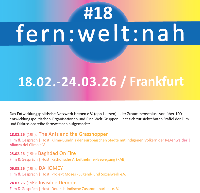Willkommen zur entwicklungspolitischen Film- und Diskussionsreihe fern:welt:nah – einem Projekt des Entwicklungspolitischen Netzwerk Hessen e.V. (epn Hessen).